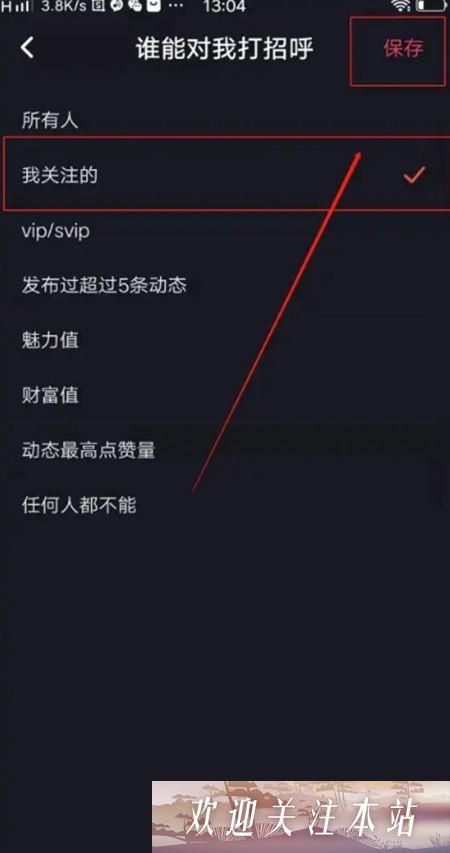 进入该功能后,会看到多个选项供用户选择。在这里,你需要选择“我关注的”选项。这意味着,只有你关注的人才有权限给你发起打招呼的请求。确保选中该选项后,点击保存,完成设置。