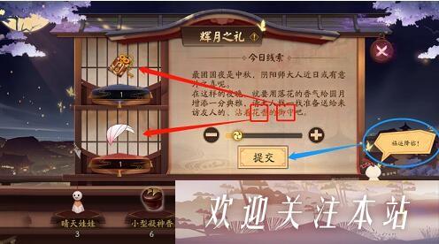 4. 对于“月神赐福”环节,玩家需要完成庭院签到,从而获取提交材料的线索,并根据提示提交必要道具(每次需要提交2个道具方可获取福气值,提交正确的可获取30点,错误则为20点),这样可以直接获得福气值。