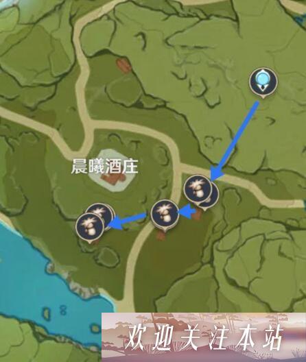(在晨曦酒庄,从风神像出发,沿着所指的路线就能顺利找到慕风蘑菇进行采集。)