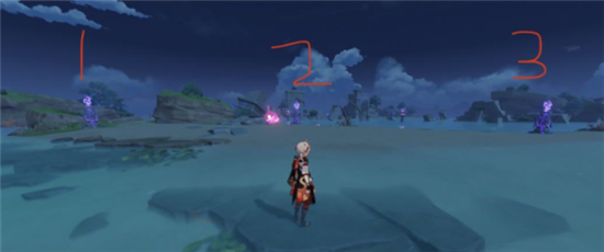 2、借助风场起飞,可以看到紫色的雷元素在进行位移,等它第三段移动到下图位置的时候降落触碰互动,然后快速落回到小岛上。
