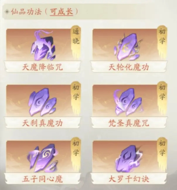 包括天魔降临咒、天轮化魔功、天刹真魔功、梵圣真魔咒、五子同心魔等。
