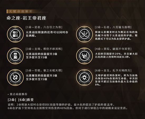 对于钟离以及整个队伍来说都是质变的命座,钟离护盾虽厚但目前流血狗会渗透护盾进行流血伤害,在这个情况下钟离的6命价值就体现出来,会在被攻击的时候回血哪怕不带治疗角色也不用担心血量问题,但对于胡行钟阵容则是负提升,毕竟胡桃是需要压低血量进行伤害提升的。