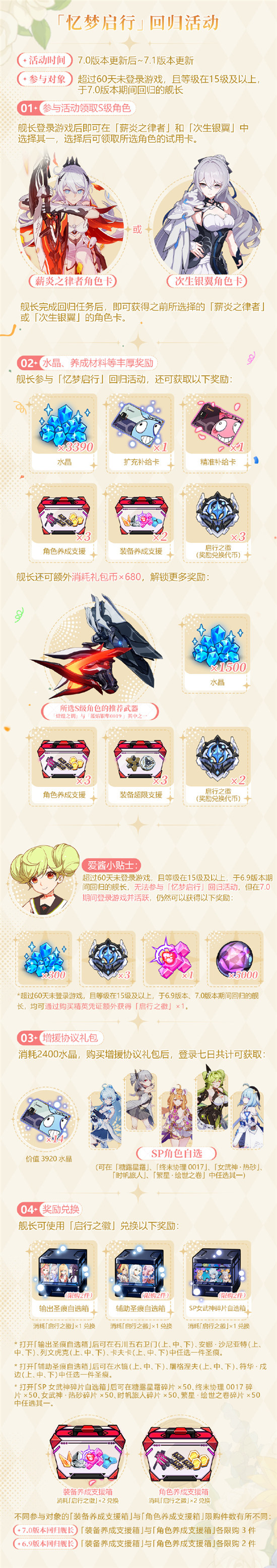 舰长好,为舰长带来「忆梦启行」回归活动的最新情报!满足参与条件的舰长,参与「忆梦启行」回归活动,可获得S级角色卡、水晶等奖励,更有「装备养成支援箱」、「角色养成支援箱」,打开可获得大量材料!