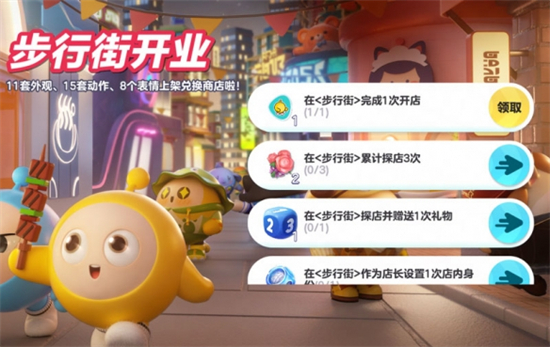 伴随着双节的来临,期待已久的“蛋仔步行街”重磅开业,成为蛋仔们逛街玩乐好去处。参与【步行街开业】活动,完成开店探店任务,即可即可获得动作【向左欢迎】、玩具【骰子】、小红花代币等奖励。同时共计11套外观、15套动作、8个表情也已经上架兑换商店,使用小红花或潮流纤维即可兑换。快到步行街解锁花样玩法,享受发家致富的创业生涯吧!