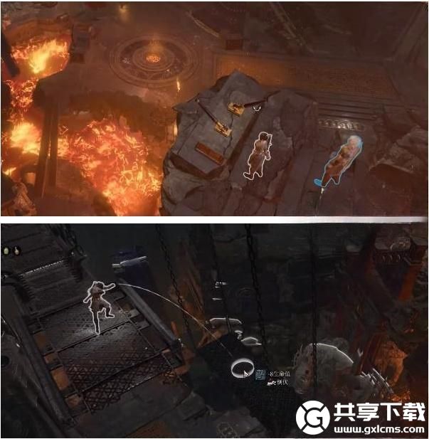 3、来到台阶上后,玩家发现两个控制杆,玩家需要留下角色操控控制杆,操控另外一个角色来到机关板上。