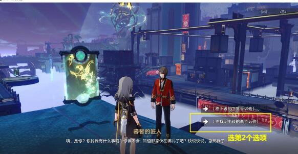 (4)到上图【睿智的匠人】位置后,完成第1次对话后,再次与【睿智的匠人】对话第2次,第2次对话,注意选择第2个选项【将持明小孩的事告诉他】,这样就可以获得1个【崇高道德的赞许】