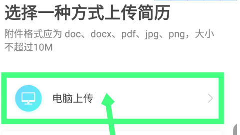 在打开的上传附近简历界面,选择上传的方式,第一种是电脑上传,点击电脑上传。如图所示