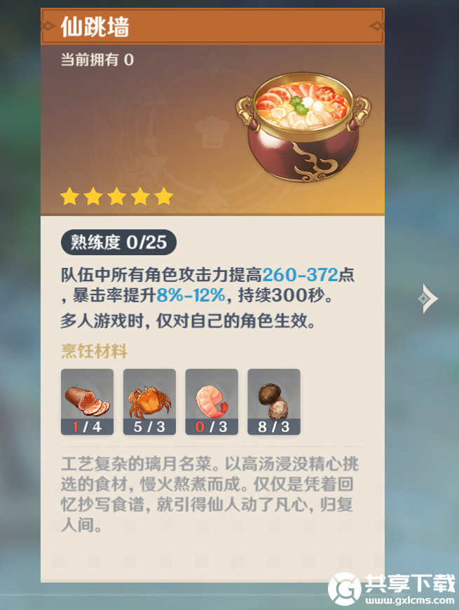 原神仙跳墙怎么做。原神作为一款热门开放世界手游,有着许多的功能,在游戏中你可以干许多的事情,打怪冒险,升级培养角色,过剧情,打牌,建造家园等等,每一个玩法都有不一样的体验感,有些玩法相较于独立,不会影响角色的培养等,在游戏里你还可以做菜,游戏中有许多的才都是与现实息息相关,甚至许多的美食博主能够将游戏中的菜复刻出来,样式精美味道可口。在游戏中有一道唯一的五星菜谱,它的功能也是非常强,那就是仙跳墙,有些新玩家不知道仙跳墙怎么制作,我们一起来看一看吧。