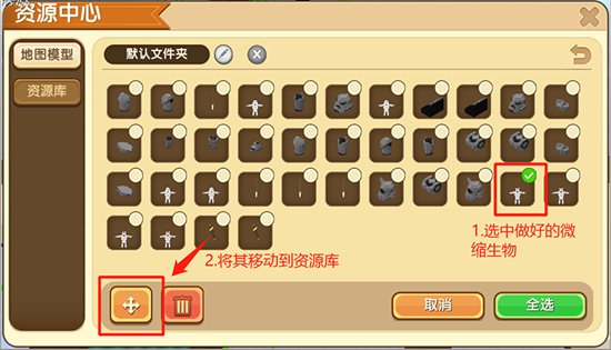 选中做好的微缩生物,点击下方红框内按钮,将它移动到资源库中。