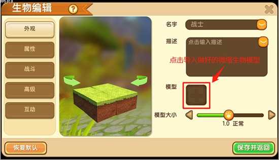 接着就可以自由设置新生物的外观了,点击下图“+”号导入我们做好的微缩生物模型。