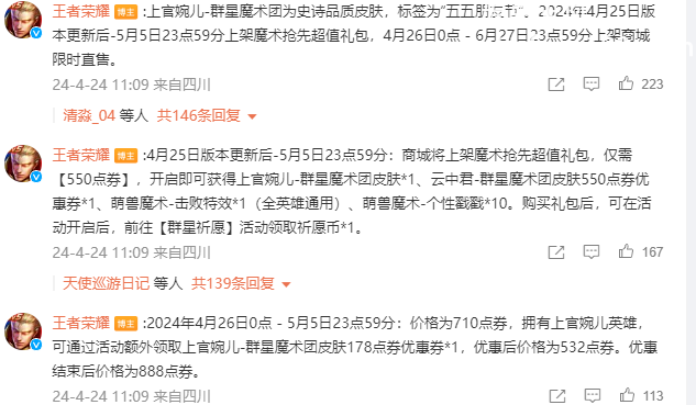 4月25日版本更新后-5月5日23点59分:商城将上架魔术抢先超值礼包,仅需【550点券】,开启即可获得上官婉儿-群星魔术团皮肤*1、云中君-群星魔术团皮肤550点券优惠券*1、萌兽魔术-击败特效*1(全英雄通用)、萌兽魔术-个性戳戳*10。购买礼包后,可在活动开启后,前往【群星祈愿】活动领取祈愿币*1。
