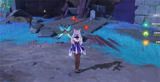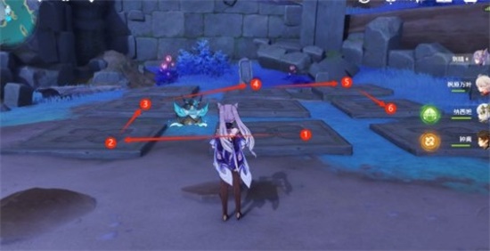 随后我们来到石板的跟前(记得先把亮着的石板踩灭),随后我们按照图中的序号,依次踩下歇着的两块石板就行