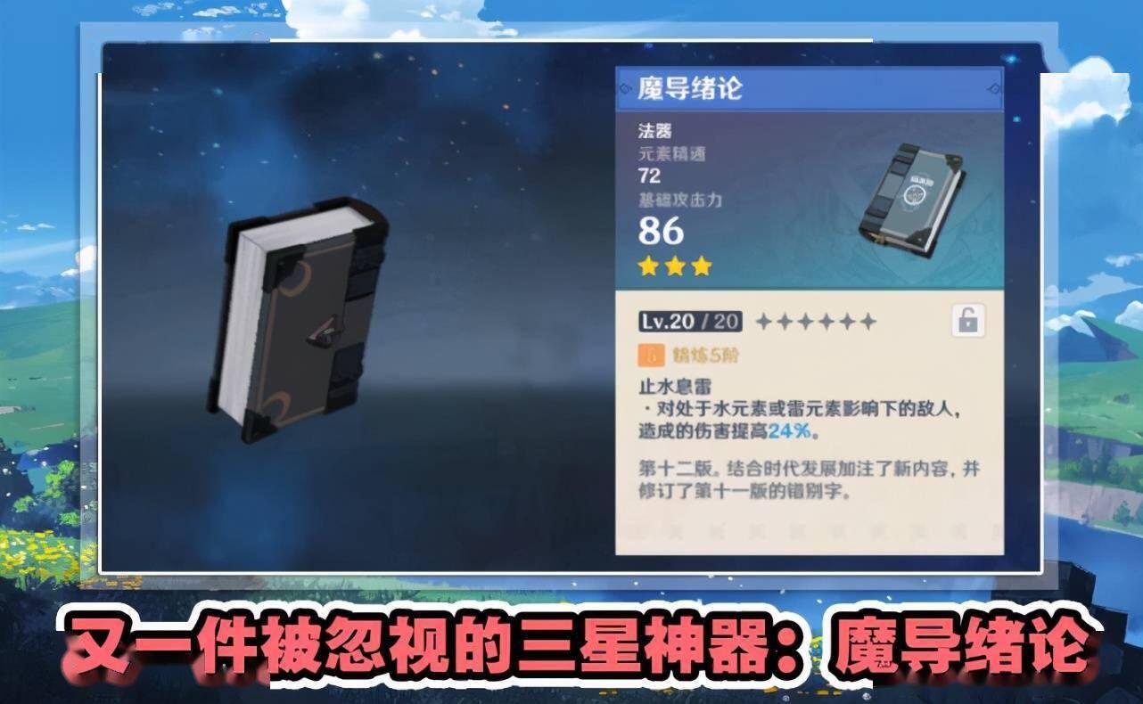 1级的时候,魔导绪论提供38点基础攻击和41点元素精通加成,到了90级的时候,可以提供354点基础攻击和187点元素精通加成。魔导绪论的被动效果叫做止水息雷,对处于水元素或雷元素影响下的敌人,造成的伤害提高12%,如果是精炼5阶的话,造成的伤害提升24%。看到这里,大家是不是联想到了另外两件法器,分别是万国诸海图谱和祭礼残章,这两件法器也可以提供元素精通加成。