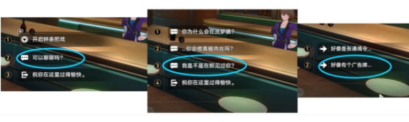 3、与她对话,第一个对话选项随意,接下来按照如下选择,选择出现的“它让我带句话给你”选项;