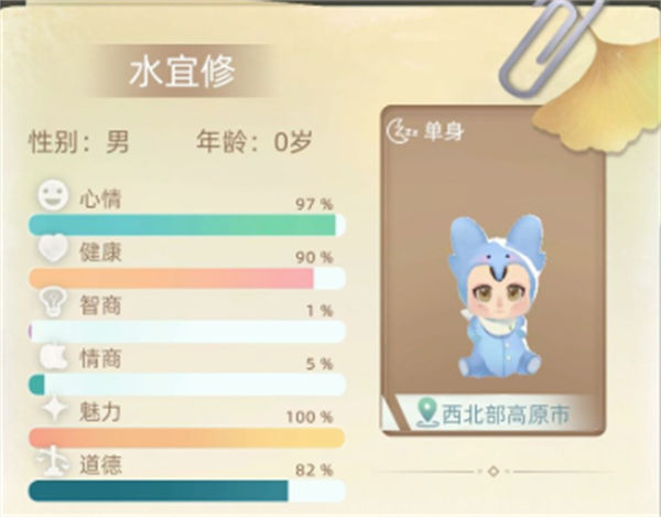 1. 心情:通过在公园散步、学校玩耍、参与随机事件等方式提升心情值。