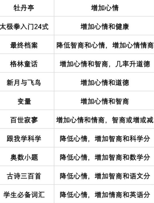 而对于学生时代,书是提高属性必不可少的方式,特别是小学和初中的时候,书店是每年必去的,要是零钱足够,推荐用在买书上。每年免费读的书有好几种,挑选对自己有用的书是重中之重。下面是我整理的各种书作用,供大家参考(不一定全部属性都能加,有时只能加一种,有时都能加)