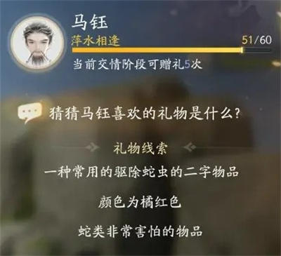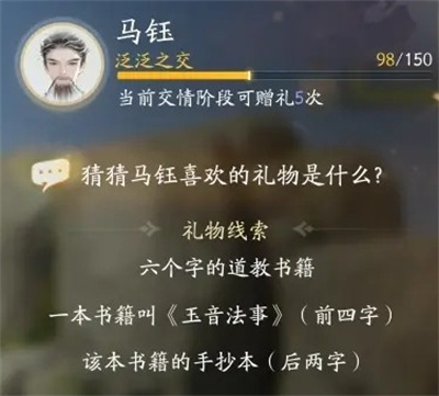 射雕中每一个侠侍喜欢的礼物都是不同的,玩家赠送对应的礼物可以提升侠侍好感,有很多玩家不知道马钰喜欢的礼物是什么,以下为大家进行详细介绍。