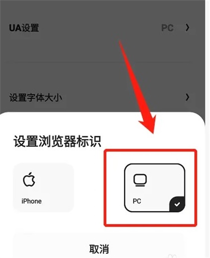 5.最后在弹出的页面里,选择PC选项即可设置网页模式为电脑版。