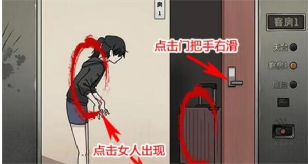 2、在客房中,点击女人可以找到怪异的女人。向右滑动门把手可以找到女士行李箱。地上有一个人影。