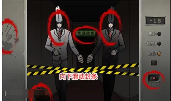 4、在底层,墙上有一个手印。门口有一只黑猫。向下滑动封条可以看到两个人。