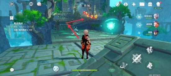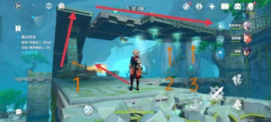 3.消灭怪物后,原路返回,将台阶下方左侧的风场改为吹向迎风台,使平台倾斜。回到台阶上,按红色箭头方向前进,在5处将风场改为朝上。