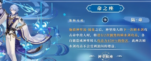 施放E后的第一次瞬水剑有3次伤害,1次是E提供的瞬水剑伤害,另外两次是该命座提供的瞬水剑伤害,这两种瞬水剑各自受益的倍率不同,其余乘区均相同,前者可享受浪闪效果提供的增伤,后者享受不到,前者享受的是E提供的伤害倍率,后者享受的是该命座提供的倍率。后者两次瞬水剑加起来共有900%的倍率,虽然不能享受到浪闪提供的增伤效果,但是在高倍率的加持下,伤害并不低。