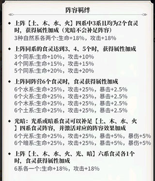 1、食灵们将以6人一组的数量进行组队战斗,值得注意的是,除了他们之间的不同职业搭配,他们之间的属性不同搭配也对战力增长有奇效哦!食灵们共有土、木、水、火、光、暗六系,根据上阵的各属性数量不同,将会触发不同的阵容羁绊,对全队进行增强。