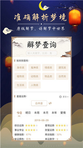 周公解梦大全查询免费版是一款免费周公解梦大全查询系统。它在原版周公解梦的基础上,给予以深度的解梦分析,限免梦的深层含义,打造专业的周公解梦,翻译了*权威的原版周公解梦资料,拥有*全面的现代周公解梦限免大全查询数据,供广大网友进行解梦查询。