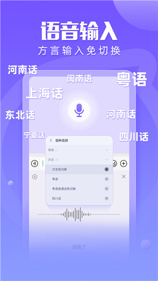 分钟400字,语音输入带你飞;支持19种方言输入,能够听懂你的家乡话;支持随声译,说中文出英文!