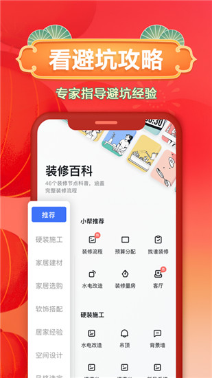 汇集了从装修前的准备工作,到拆除水电、泥瓦木工、厨卫施工、软装收纳等关键环节避坑经验,一站式找灵感、学知识,指导装修全流程。